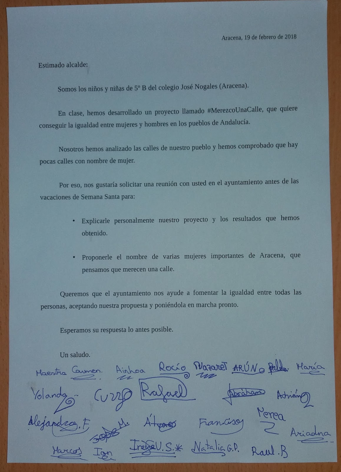 A lo largo del segundo trimestre, el alumnado de 5° B del C.E.Pr. José Nogales de Aracena (Huelva) se embarcó, junto con su profesora Carmen Muñoz, en el proyecto «Merezco una calle».