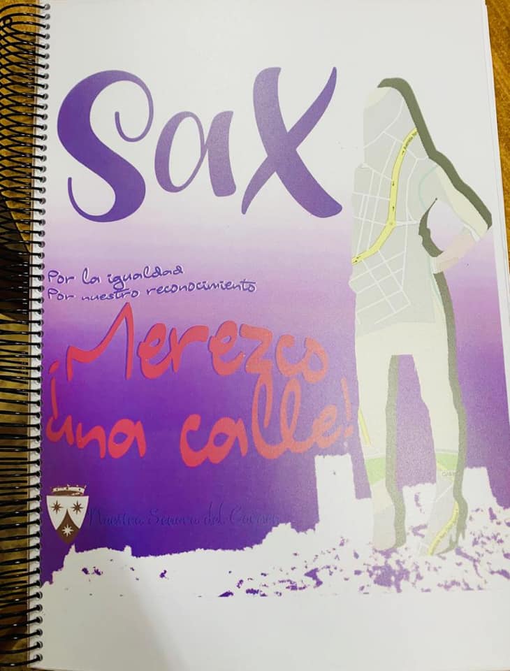 Descubrimos que la gran mayoría de las calles de Sax, 85 aproximadamente, llevan nombre de hombre y alrededor de 8 de mujer, siendo la mayoría nombres de Vírgenes o Santas”.