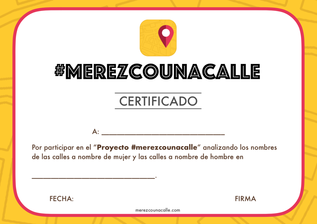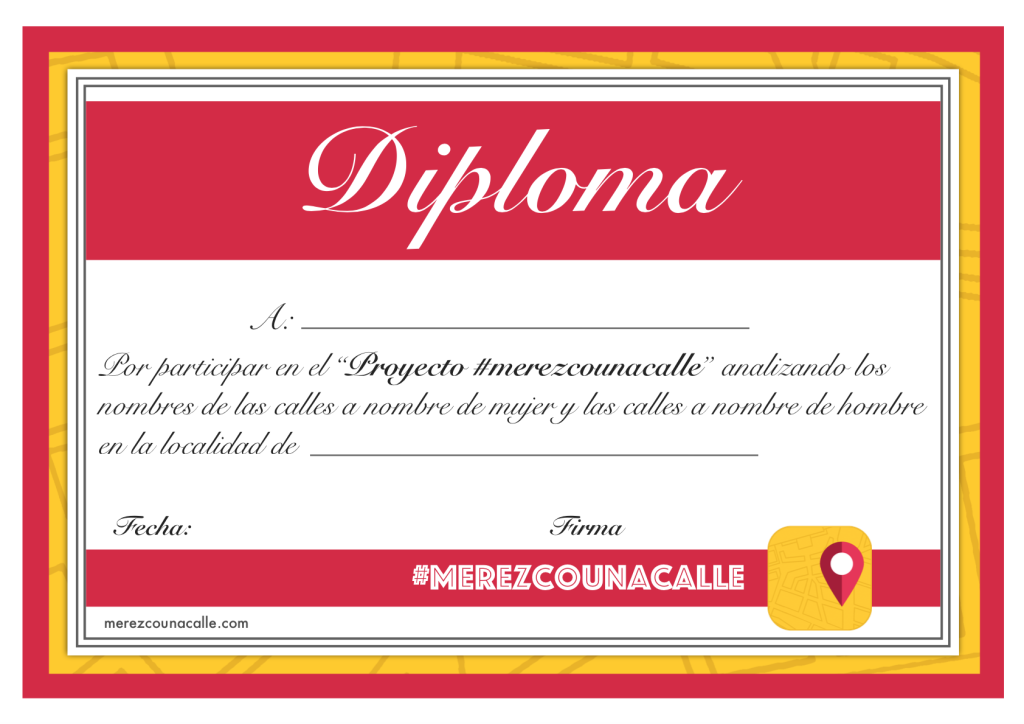 Este diploma, creado especialmente para el proyecto #Merezcounacalle, está disponible para que el profesorado lo descargue y lo entregue a todo el alumnado que haya participado en la actividad.